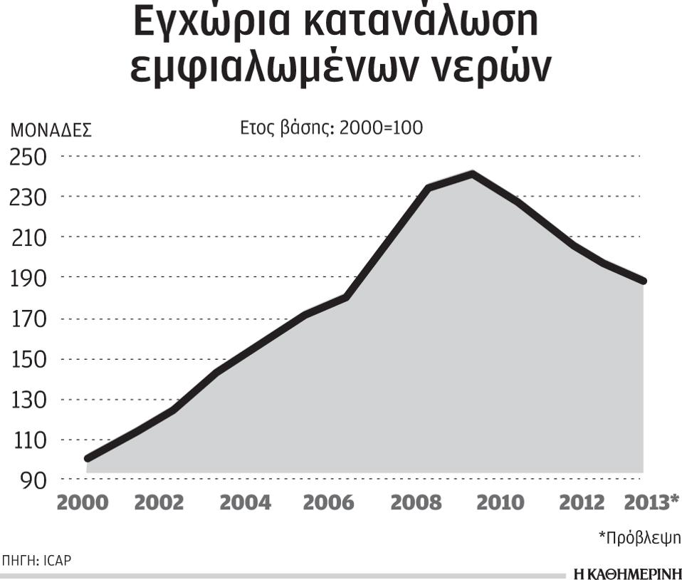 Η διευθύντρια Οικονομικών και Κλαδικών Μελετών της ICAP Group, Σταματίνα Παντελαίου, σημειώνει σχετικά με τις εξελίξεις της συγκεκριμένης αγοράς: «Η εγχώρια κατανάλωση εμφιαλωμένων νερών (σε λίτρα) αυξήθηκε την περίοδο 1990-2008 με μέσο ετήσιο ρυθμό ανόδου 12%. Το 2009 ο ρυθμός ανόδου επιβραδύνθηκε σημαντικά (αύξηση μόλις 2%), ενώ από το 2010 η αγορά παρουσιάζει πτωτική πορεία. Ειδικότερα, τα έτη 2011 και 2012 η κατανάλωση μειώθηκε κατά 8,1% και 6,5% αντίστοιχα. Η καθοδική πορεία εκτιμάται ότι συνεχίστηκε και το 2013, αλλά με μικρότερο ρυθμό.